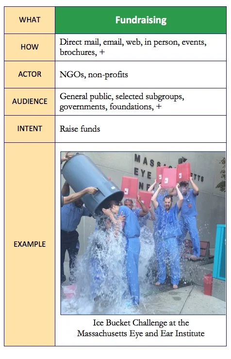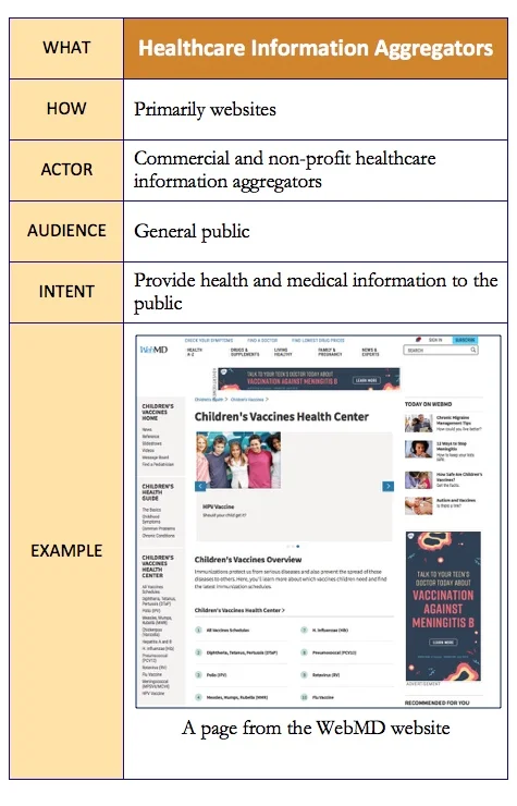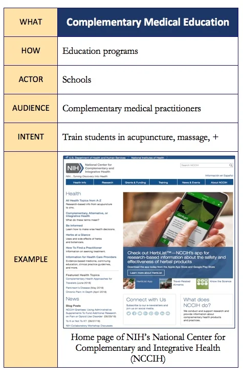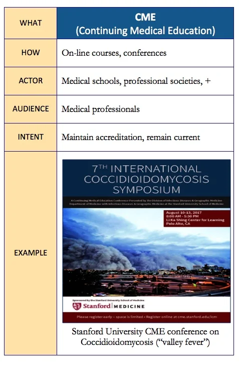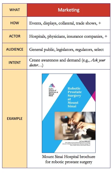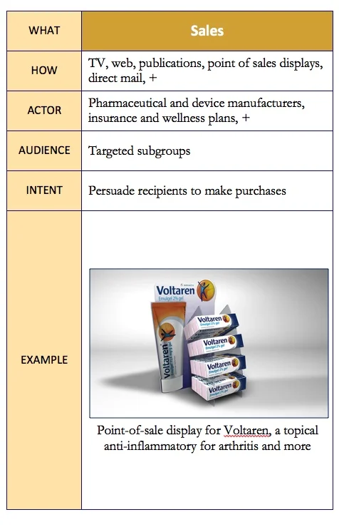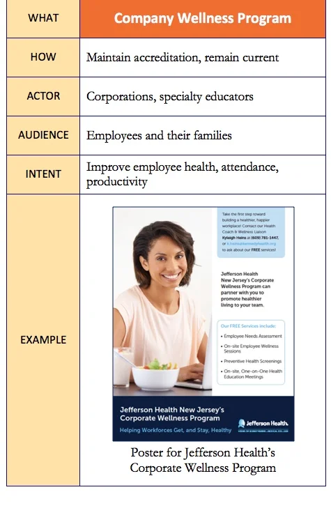 Clearly this is not an exhaustive list, if only because technology is constantly giving rise to new ways to communicate in health-related fields and elsewhere. (Take, for example, the recent use of geofencing around hospitals.) And there are layers of detail that would have overwhelmed any presentation. For instance, there are companies that make corporate wellness programs for other companies, and there are companies that make the communications materials for the companies that make the corporate wellness programs for other companies…and so on. So there could certainly be more methods and every cell in the table and within the cards could end in + or etc. Instead, this is a generalized sketch of the field with just enough detail to show what a rich and complex landscape health communications inhabit.