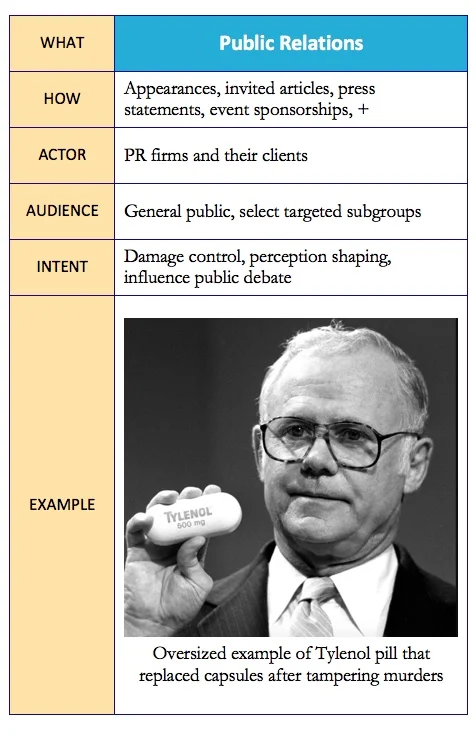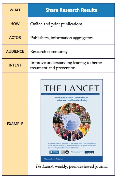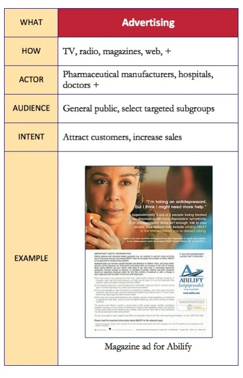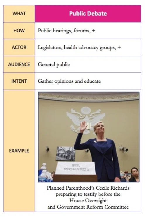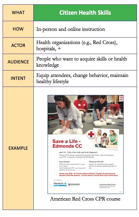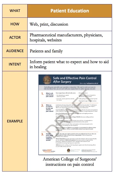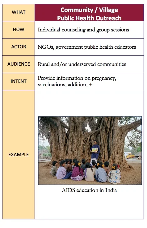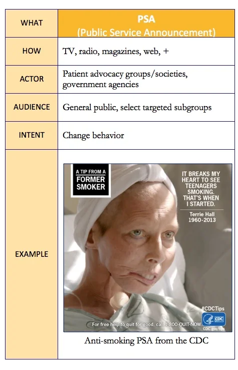 Instead, I’ve created a pretty dense table of the what, how, who, etc. of health communications, followed by the individual tiles or cards that would have appeared in the poster. (The cards also contain examples.) In the poster image above and in both the table and the cards below, the various communications methods are arranged in a spectrum that ranges from persuasion to education.